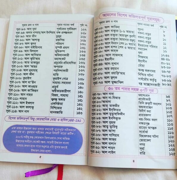 বইটিতে দৈনন্দিন আমলের ১৩টি ফজিলতপূর্ণ সূরা সহ মোট ৪৭টি সূরা কালার কোডেড তাজবীদ ও প্রতিটি আরবী শব্দের নিচে শব্দটির উচ্চারণ ও অনুবাদ সহ সংকলিত করা হয়েছে। যারা আরবী ভালোভাবে পড়তে পারেন না কিন্তু শিখতে চান তাদের জন্য বইটি খুবই সহায়ক হতে পারে।