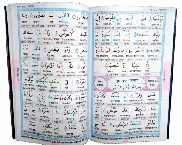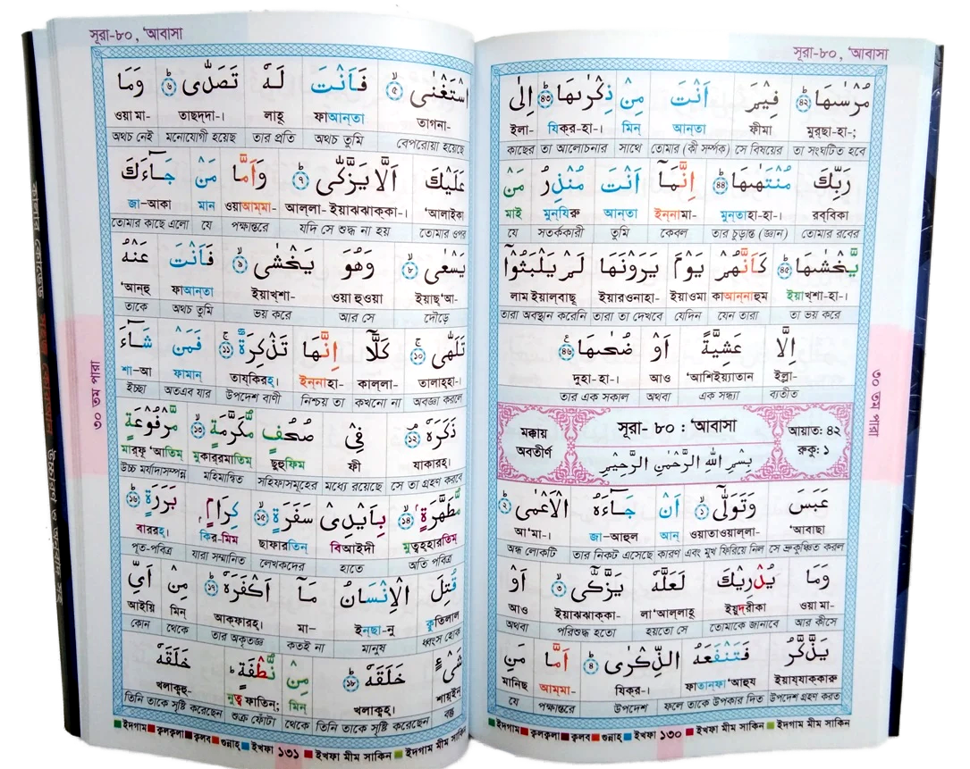 বাংলায় উচ্চারণ সহযোগিতা ছাড়াও বইটিতে গুরুত্বপূর্ণ তাজবীদগুলো রং চিহ্নিত করে দেয়া হয়েছে, ফলে খুব সহজেই আপনি মাদ, গুন্নাহ, ইখফা, ঈদগম, ইক্বলাব এর মতো গুরুত্বপূর্ণ তাজবীদগুলো আদায় করে পড়তে পারবেন ইন-শা-আল্লাহ।